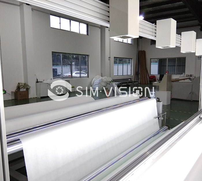 針對(duì)無紡布本身厚薄不均、結(jié)構(gòu)稀疏不均的材料特性以及瑕疵分布的隨機(jī)性(無紡布的正面、反面及中間),傳統(tǒng)的透射打光方式容易造成系統(tǒng)的漏檢及誤報(bào)。賽默斐視SIMV無紡布污點(diǎn)檢測儀采用無影亮場組成檢測環(huán)境,即一根光源在材料下方透射,另外一根光源在材料上方反射,在生產(chǎn)線開始運(yùn)行時(shí),CCD相機(jī)根據(jù)編碼器采集的速度信號(hào)進(jìn)行同步掃描拍攝,將采集到的圖像通過SIMV圖像分析軟件算法進(jìn)行動(dòng)態(tài)欲知分割,通過瑕疵圖像與正常產(chǎn)品的灰階差異,從而發(fā)現(xiàn)瑕疵并做進(jìn)行報(bào)警、統(tǒng)計(jì)、分類、記錄等操作。